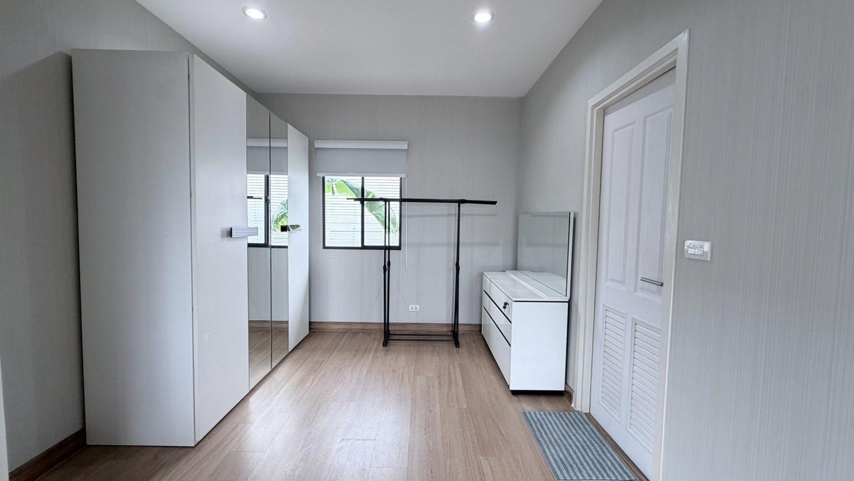 . ห้องนอนใหญ่พร้อมเตียง ตู้เสื้อผ้า และโต๊ะเครื่องแป้ง
