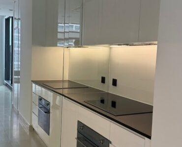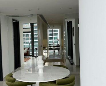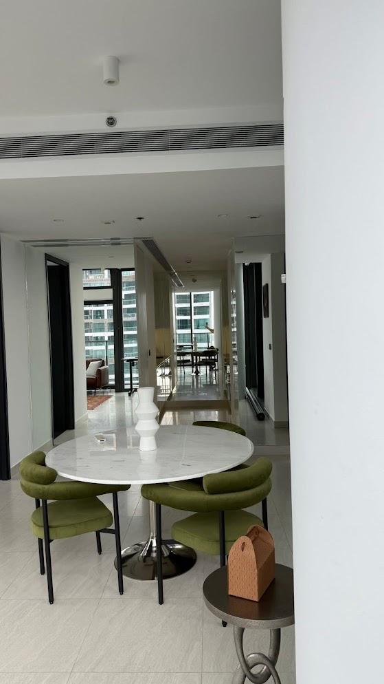 . The interior is fully furnished with premium decor and high-end appliances, reflecting a sophisticated urban lifestyle.
