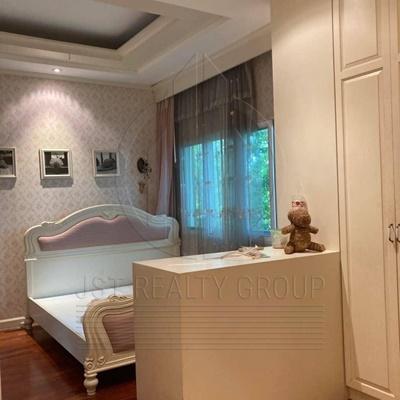 . The charm of this residence is its status as the absolute best location within the heart of the village. The property is uniquely positioned adjacent to water on two sides and sits right next to the community playground, providing a serene and picturesque atmosphere. The main house features 4 spacious bedrooms and 5 bathrooms. A highlight is the additional guest house specially built to serve as a private living room and a dedicated exercise room. Outside, a beautiful fish pond and a custom-built relaxation pavilion create a perfect outdoor sanctuary. The property provides an exceptional parking capacity for up to 8 cars within the private gated area.